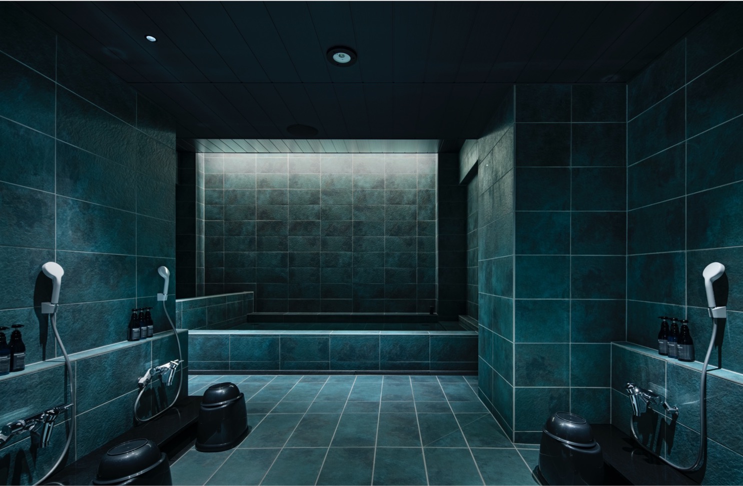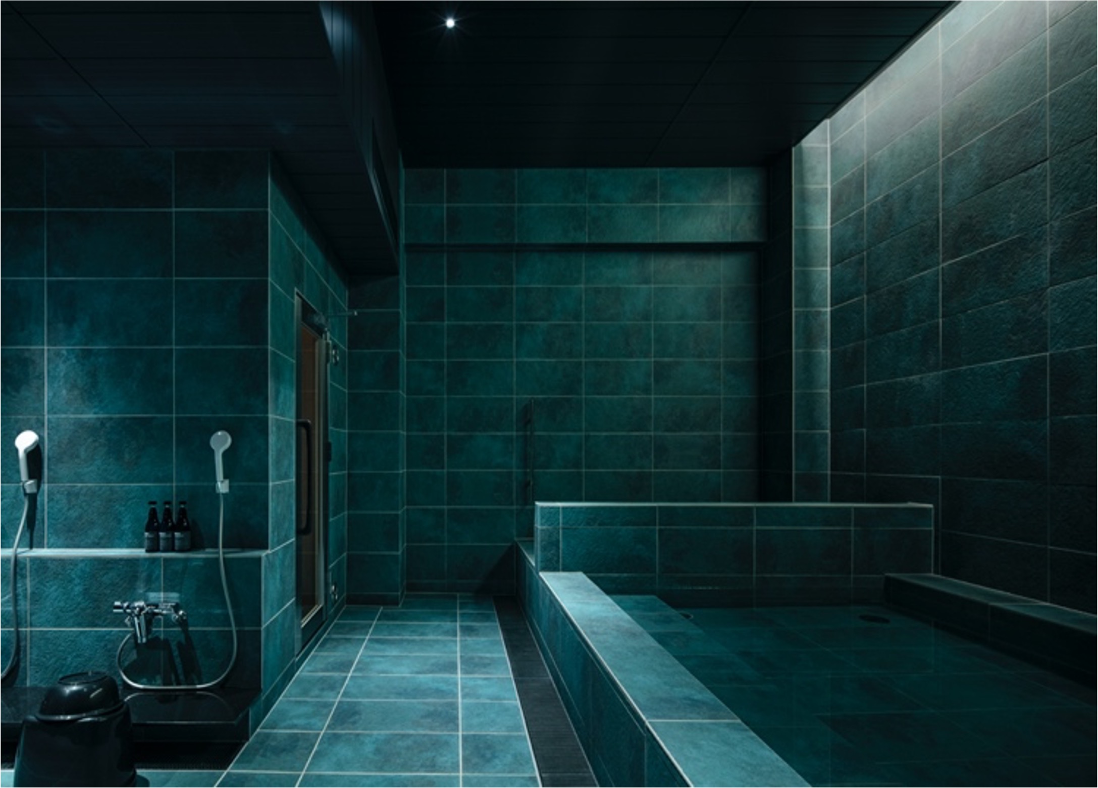 洞窟のイメージで、青色・緑色で統一された空間を照らす照明が、湯面にきらめきとその影を作り出し、