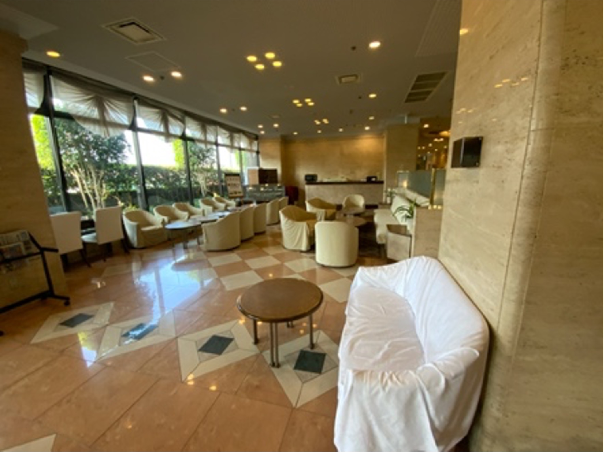 ラウンジ・ロビーは、かつてレンガの生産地であり桜の名所が多い深谷のイメージに合う素材・カラーを取り入れ、天井・壁上部を艶のないザラザラとした吹き付け塗装で仕上げることで、ピカピカの既存大理石との調和を図った。