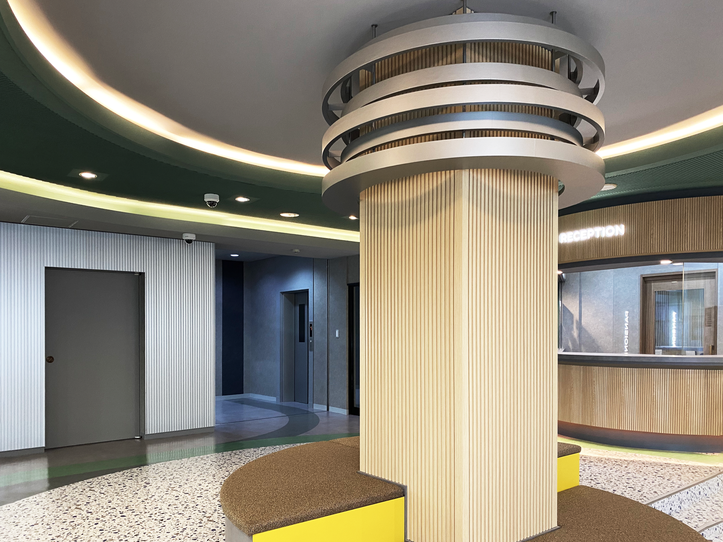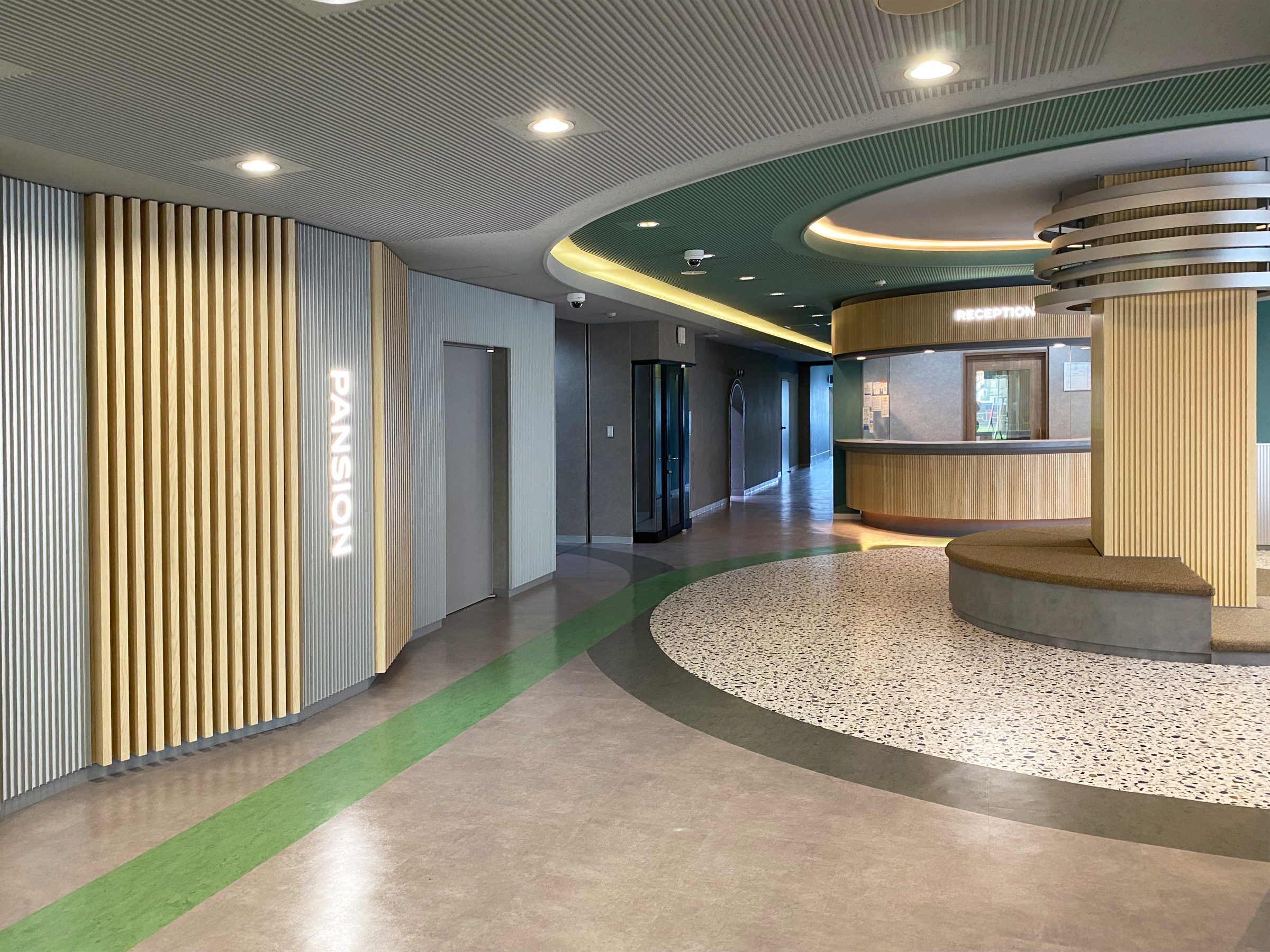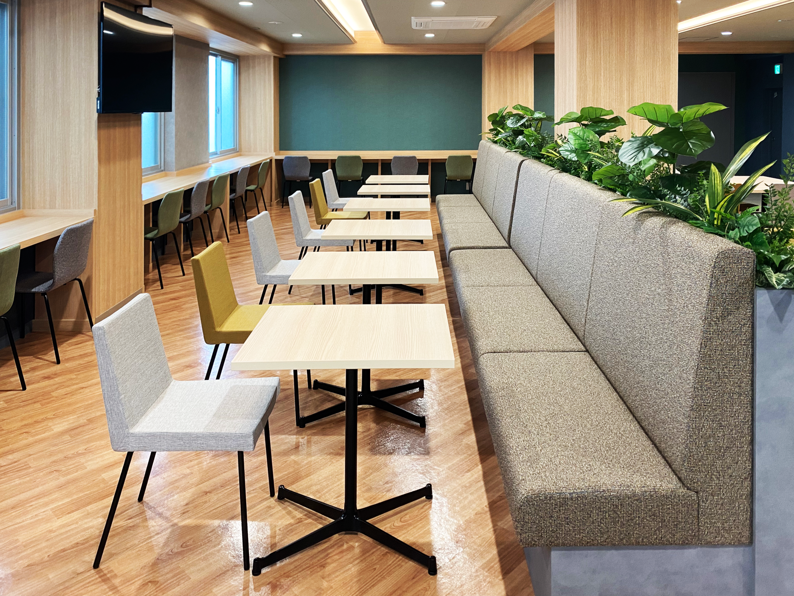 エントランスや食堂など、内装の各所にも外観のカラーをちりばめ、統一感を持たせることで