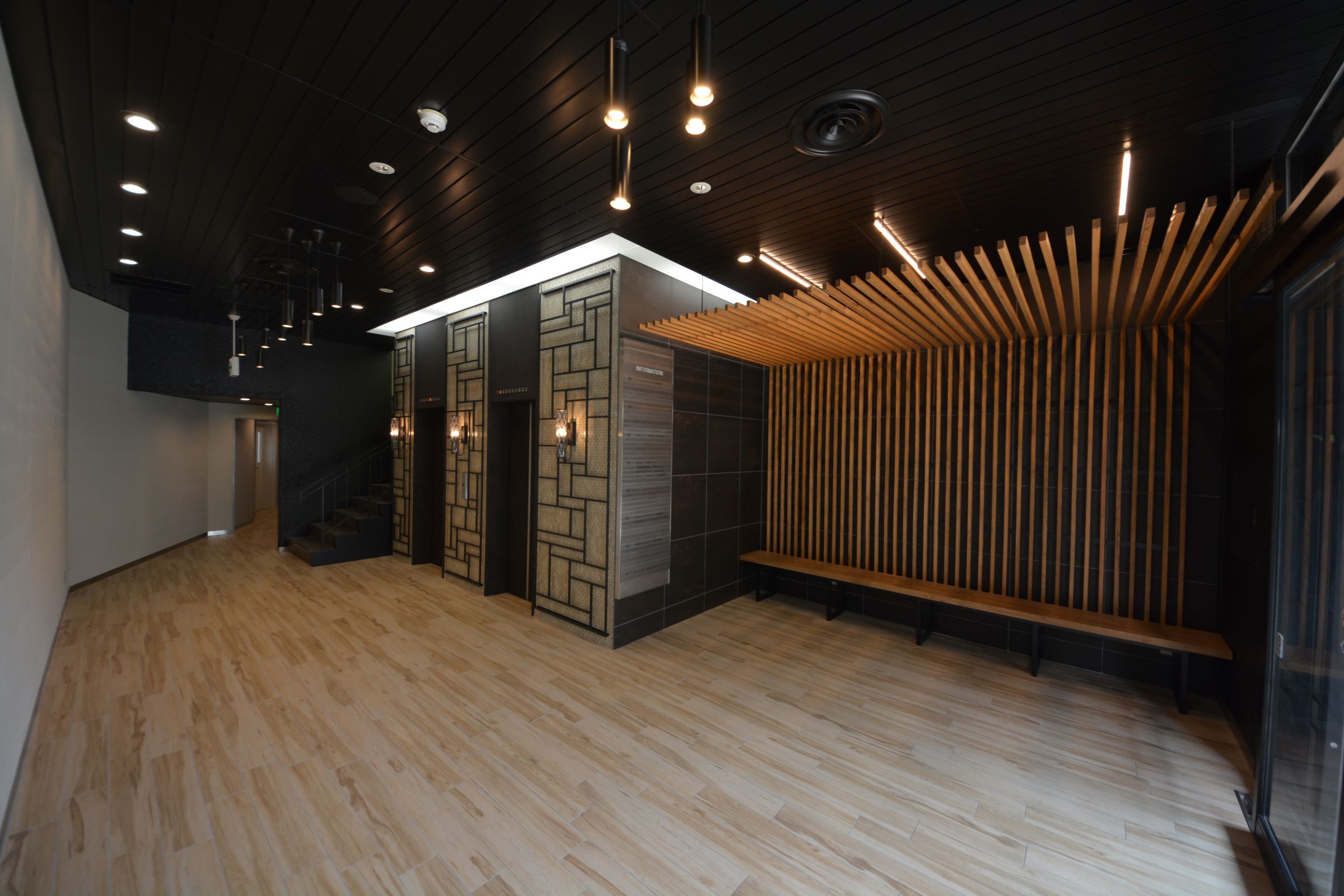 内装のデザインもファサードを踏襲し、織目のようなコントラストのある色構成にすることで、