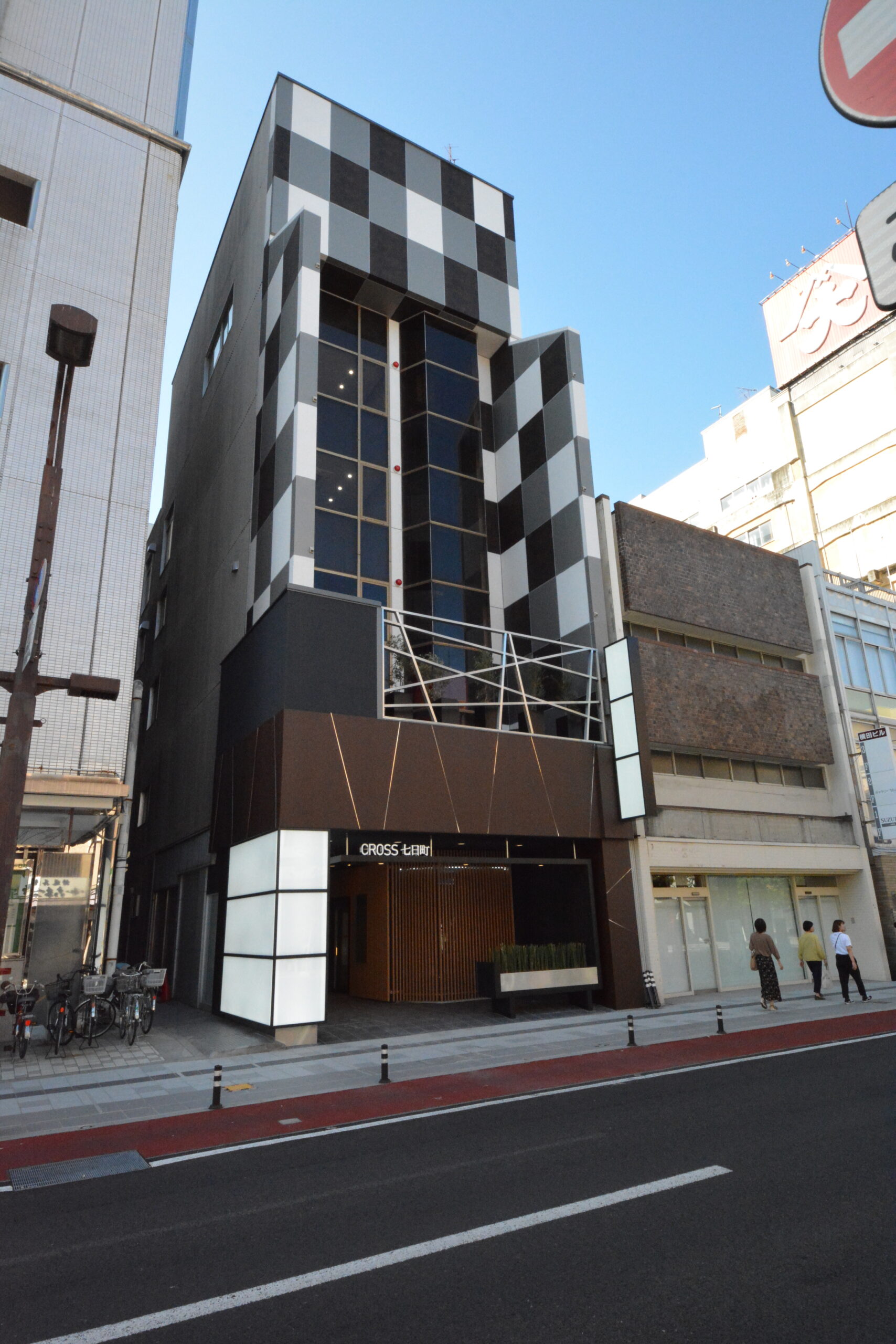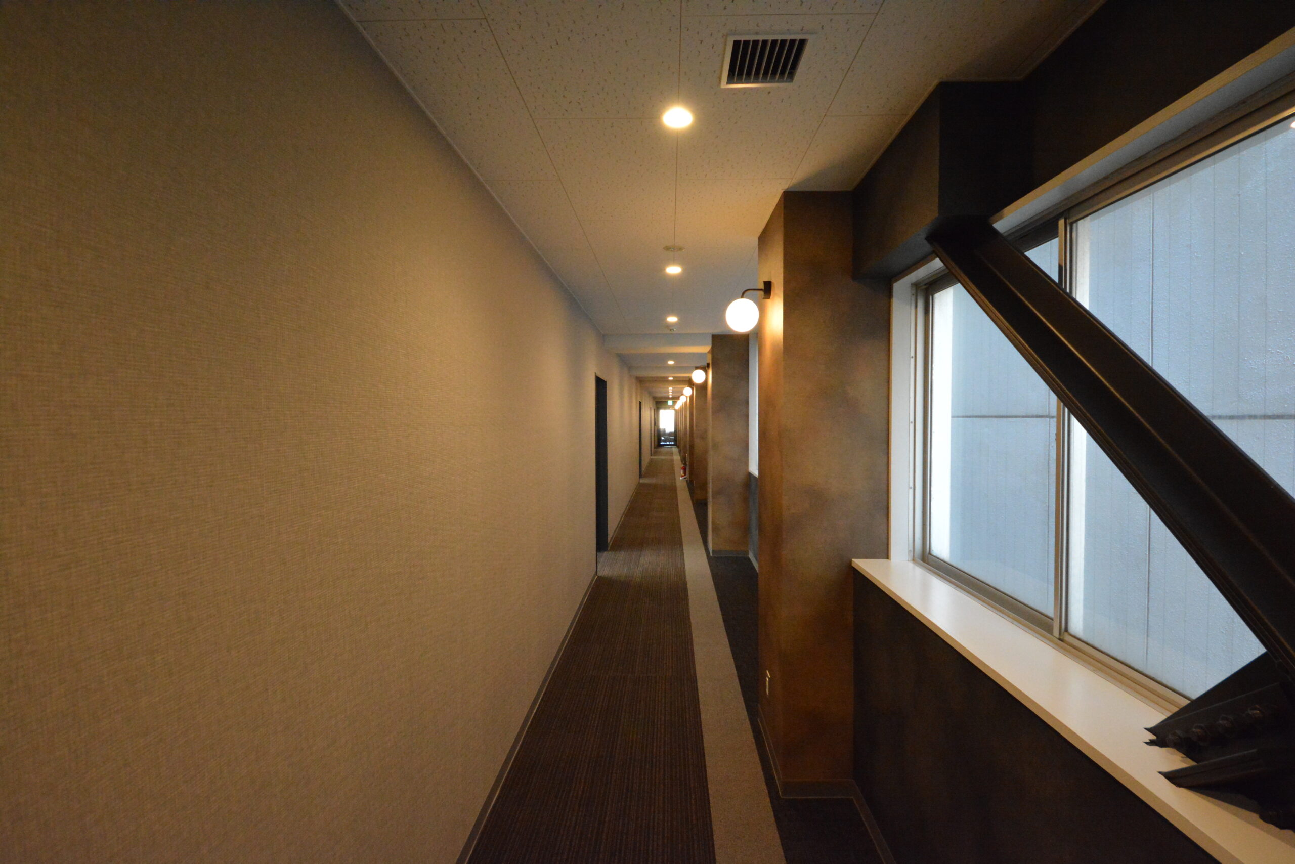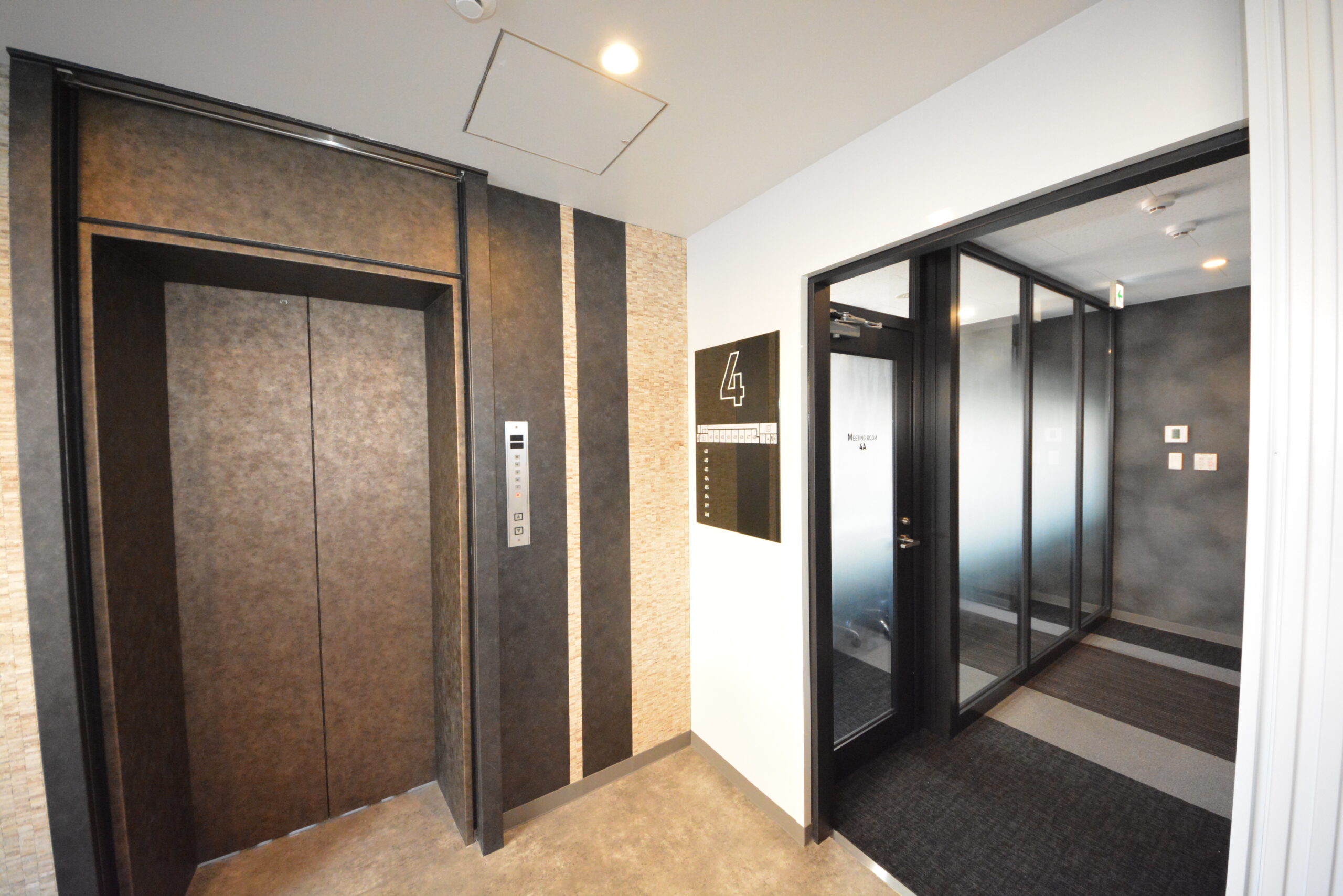 現状の暗くわかりづらいエントランスアプローチを、エントランスとしての視認性を高めるため、ファサードの門型デザインに加え、二重の門型デザインを重ねることで、より強調されたエントランスとしている。 EVシャフト周囲には、ルーバーを設置し、背面に照明を設置することで、エントランス・街を照らす「行灯」のようなデザインとした。