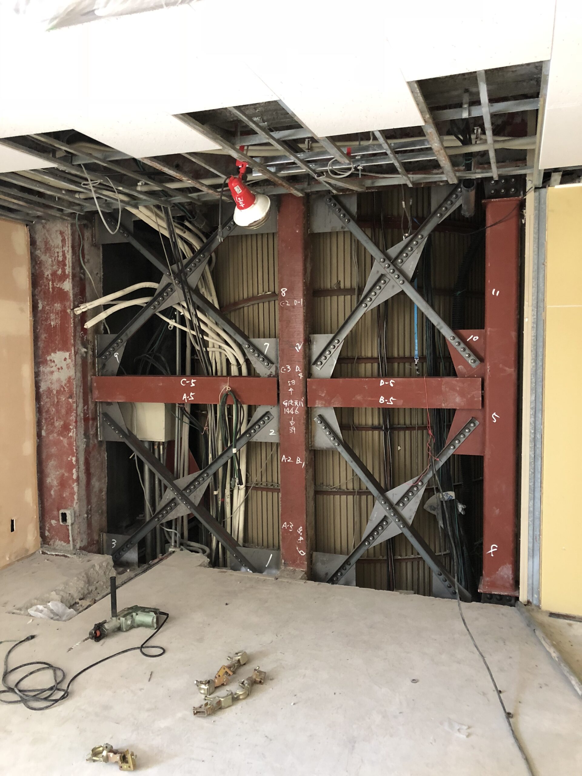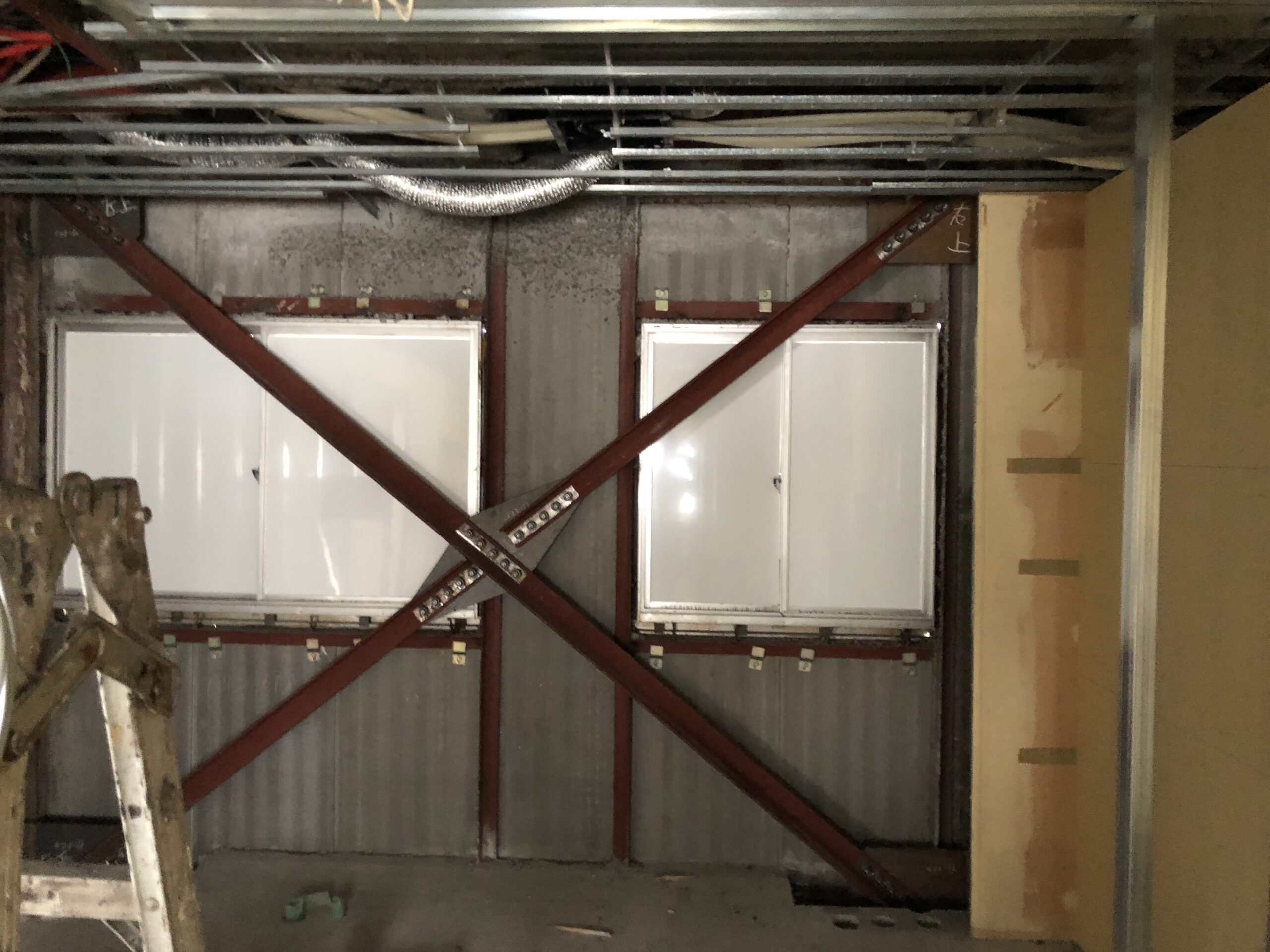 本物件は1978年竣工の物件で、2〜6階X方向、Y方向のIS値が新耐震基準の0.6を下回ったため、リノベーション工事とともに2〜6階の耐震改修工事を行なった。